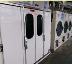 また、溶剤回収が非対応の乾燥機と比べて、当社が導入したドライクリーニングで使用する石油系溶剤が回収・再利用できる乾燥機溶剤は、溶剤を揮発させるための熱風が低温で、なおかつ乾燥時間が短時間で済むため、蒸気エネルギー排出が半分以下と大幅削減につながっています。
