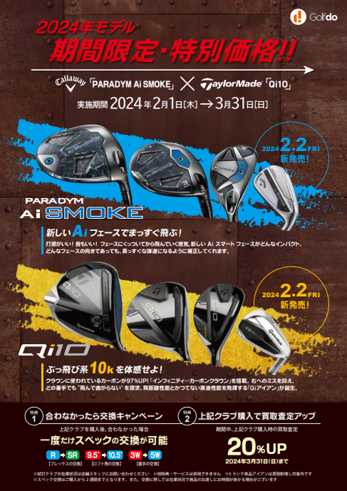 株式会社ゴルフ・ドゥ(本社 さいたま市 代表取締役社長:佐久間功 以下、当社)は、2024年2月2日(金)に発売予定のキャロウェイゴルフおよびテーラーメイドの新作が安心してお得に購入できるキャンペーンを2024年2月1日(木)より、「ゴルフドゥ!」24店舗にて実施します。