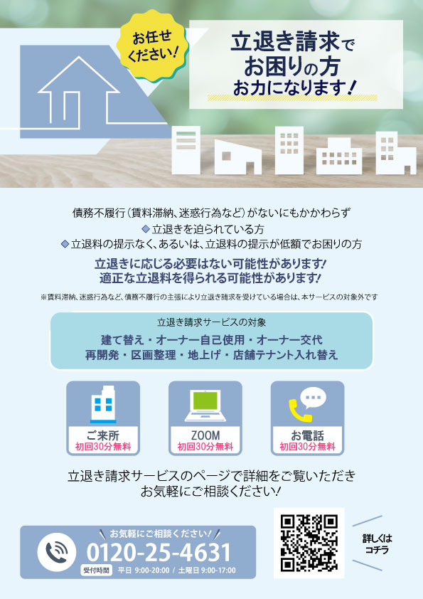 老朽化や開発などを理由として立退き請求を受けてお困りの方は、お気軽にご相談ください。