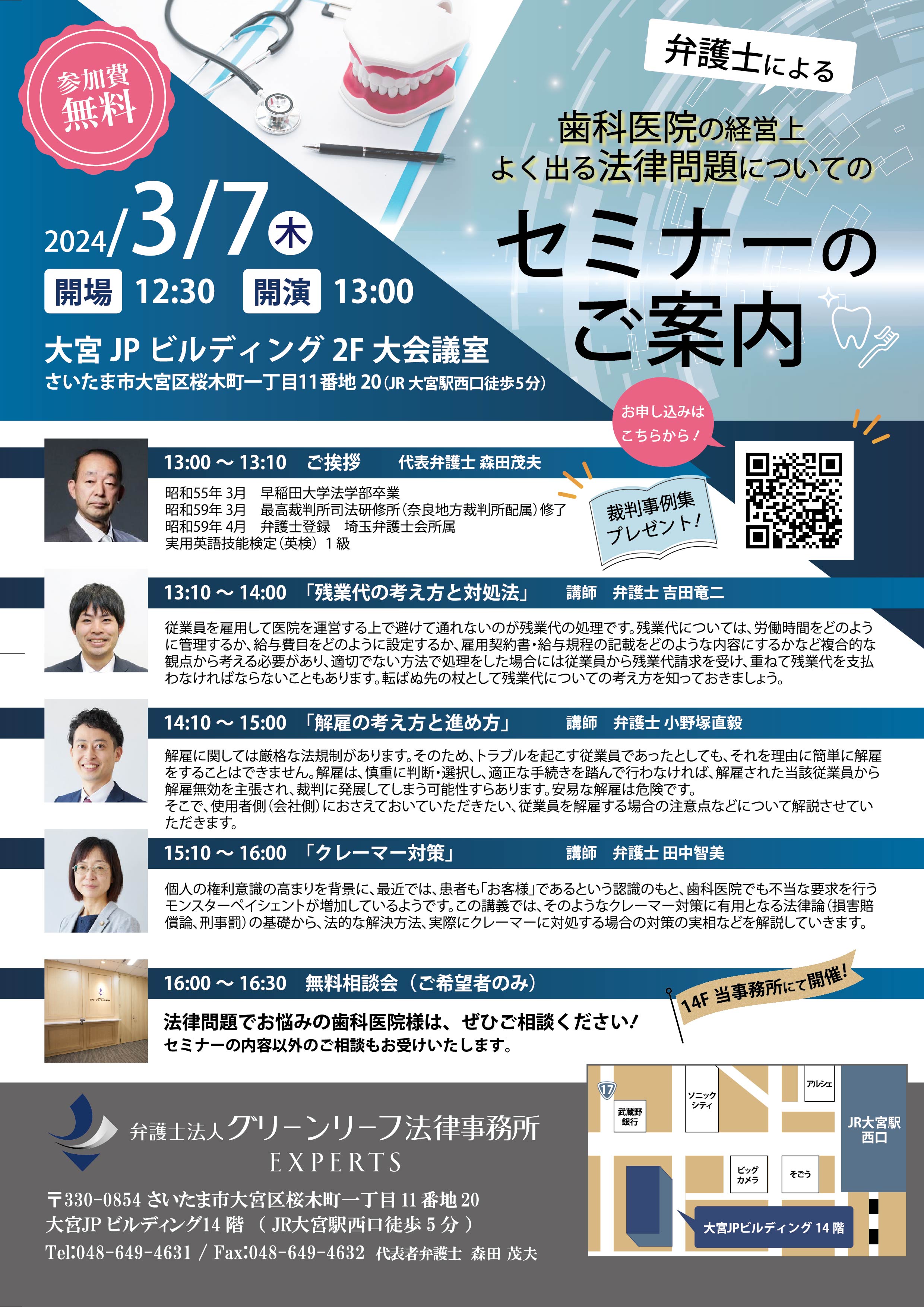 また、セミナー後、16時から無料相談会(ご希望者のみ)も開催します。