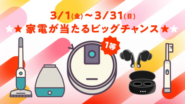 3月の目玉企画は『☆★家電が当たるビッグチャンス★☆』。抽選で1名様にロボット掃除機ルンバが、3名様にSONYのワイヤレスイヤホンが当たります。さらに全国の有名スイーツと交換できるギフトカードが当たる「抽選で『美味しいギフト』を当てよう♪」と『お店で使えるギフトクーポン抽選!』も引き続き開催が決定。定番の3企画『☆☆抽選で「図書カードネットギフト」が当たる☆☆』や『Amazonギフトカード抽選』、『楽天抽選』を加え合計6企画を毎日開催します。