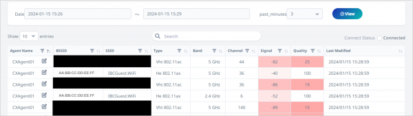 IBCが新たにリリースした「Wifi監視機能」は、ユーザーの端末が接続している無線(アクセスポイント)だけでなく、端末が受信している全てのアクセスポイントの接続情報および信号強度を分かりやすく可視化することにより、誰でも簡単に無線環境を管理することができます。ユーザーに接続して欲しいアクセスポイントの電波強度を見ることにより、野良SSIDと呼ばれるようなアクセスポイントの影響度も調査することができるようになりました。