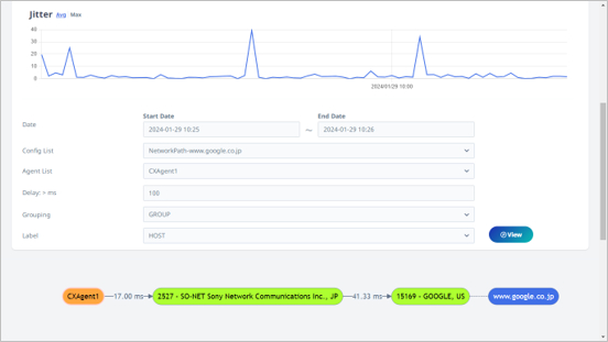 監視元となる各エージェントから監視先までのネットワークパスを、経路上のホップ毎の IP アドレスや応答値といった情報の他、パケットロス、ジッターなど詳細な情報と共に表示。これにより特定に時間のかかっていた遅延原因が可視化され、誰でも一目瞭然でその原因を特定できるようになります。また、測定された内容が前回値と比較し大きくかい離する場合に警告をおこなうなど、利用者に認識しやすい、わかりやすい機能を提供します。