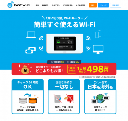 「イージーWi-Fi」は、モバイルWiFiルーター本体と通信データがセットになった商品です。電源をONするだけで即日利用が可能となっており、面倒な手続きや操作が一切ございません。また、専用サイトより通信データのチャージが可能です。これまで、国内通信専用として販売しておりましたが、昨今の海外での通信ニーズに応えるべく、新たに海外通信用のデータチャージプランの提供を開始いたしました。ビジネスや観光等の目的で海外へお出かけの際、海外データチャージプランを購入いただくだけで、海外でもストレスなくインターネットをご利用いただけます。