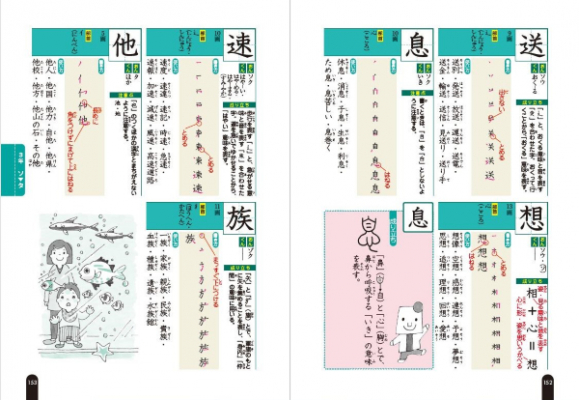 小学校で学習するすべての漢字の正しい書き方を、一画ずつ示しています。小学校で習う音読み・訓読みはもちろん、中学校以上で習う読みも掲載しているので、コンパクトな辞書として長く活用できます。また、漢字を覚える助けになるよう、漢字の使い方を熟語で豊富に掲載しています。すべての漢字に成り立ちや注意点のコラムがついており、より理解が深まる構成になっています。