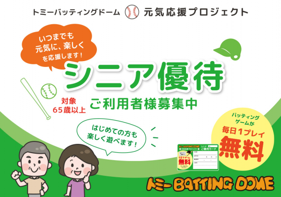 今回の”シニア優待サービス”は、簡単な申し込みで発行できる「シニア優待カード」をご提示いただくと毎日無料で1プレイ、バッティングゲームをお楽しみいただけます。曜日や時間に関係なく、何時でもご利用が可能で、初めての方でも楽しく遊んでいただけます。