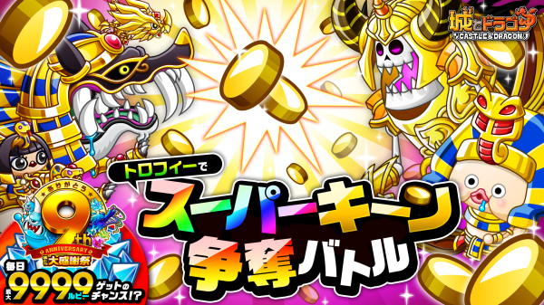 2月10日(土)から2月11日(日)まで、ゲーム内のトロフィー獲得を目指して戦うバトルイベント「トロフィーバトル」が開催されます。今回はバトルに勝利すると1日3回まで“キーン”が贈られる「トロフィーでスーパーキーン争奪バトル」が同時開催されます。また、「辰年(ドラゴンとし)!ドラゴンもりあげキャンペーン」や、「9周年記念ミッション」の第2週など、9周年を祝うイベントも引き続き開催中。今週末はぜひ『城とドラゴン』でお楽しみください!