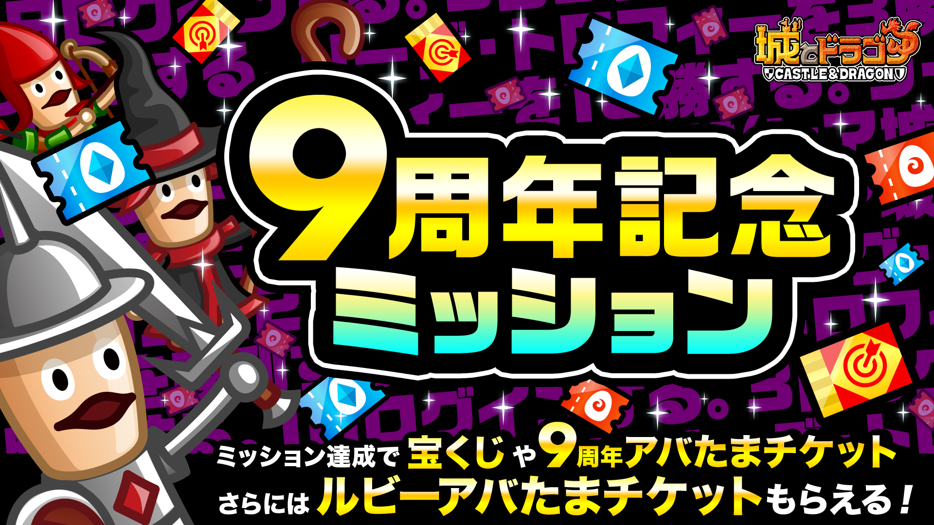 2024年1月31日(水)より「ありがとう9周年!城ドラ大感謝祭(前半)」が開催中です!特別なログインボーナスやミッション、1日1回最大“9999ルビー”が当たる「ルビーアバたま」などイベント盛りだくさん!9周年もぜひ『城ドラ』をお楽しみください!