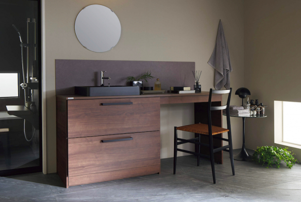 “憧れの空間を実現できる洗面化粧台”をコンセプトに、トレンドとなりつつあるベッセル型洗面化粧台を当社では初めてラ インナップしました。ベッセル型とは、カウンターの上に洗面ボ ール(ベッセル/容器)が乗っている形で、近年、造作洗面で人気です。