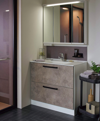 価格:間口 75 cm(開き扉+シングルレバーシャワー付き水栓+収納付き 1 面鏡)¥224,000~(税 抜き)
