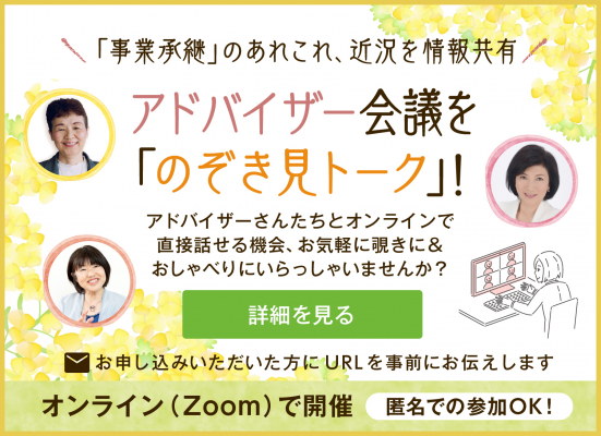 同じ境遇の方と話したい、事業承継したちょっと先輩たちは今どうしてるの? アドバイザーさんたちがどんな方か覗いてみたい、どんなお気持ちの方も歓迎です。匿名、顔出しなしでのご参加も可能。