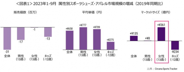 スポーツシューズ・アパレル市場規模、2023年1-9月は19年同期比135億円増