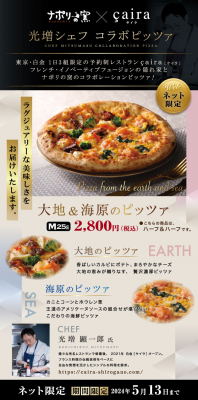 宅配ピザ「ナポリの窯」(株式会社ストロベリーコーンズ 本社:港区芝、代表取締役:宮下雅光)は、東京・白金の人気フレンチレストラン「caira(サイラ)」の光増顕一郎シェフとコラボし、「大地&海原のピッツァ」を発売いたします。
