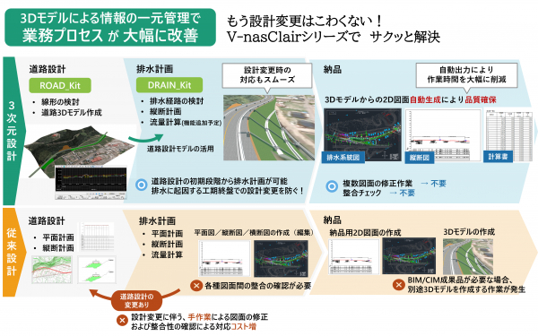 「DRAIN_Kit」は3次元の道路・地形モデルに対して排水設備の配置検討を行う3次元設計システム「V-nasClair」のアドオン製品です。