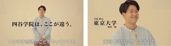 「なんで、私が東大に!?」「なんで、私が京大に!?」のキャッチコピーさながらの合格実績で、2024年度のテレビCMでは、「このままで普通のことをやっていては東大には届かない」と四谷学院に託して東大合格した生徒や、E判定から医学部に合格した生徒などが、自分のことばで合格体験を語っています。