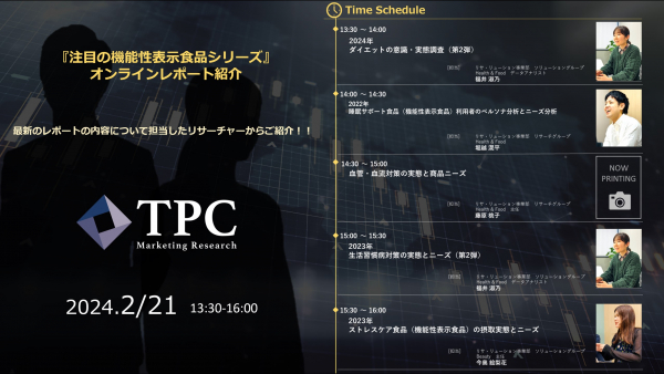 リサ・リューション事業を展開するTPCマーケティングリサーチ株式会社(代表取締役社長:松本 竜馬)は、2月21日に『注目の機能性表示食品シリーズ』オンラインレポート紹介を開催いたします。