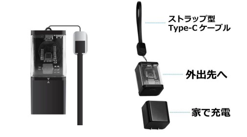 「パワーデリバリ―(PD)20WのACアダプタ」と「ストラップ型のタイプC-タイプCの充電ケーブル」が付属しています。