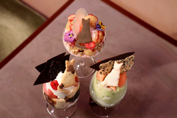 2月22日(水)の『猫の日』を記念して、2月19日(月)から25日(日)までの一週間を『猫パフェ週間』とし、期間内は3種類のパフェ全てが、お値段据え置きで猫バージョンで提供されます。全てのパフェに、猫の形のクッキーと肉球チョコレートがディスプレイされた、猫の日だけのスペシャルバージョンです。