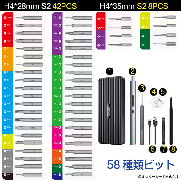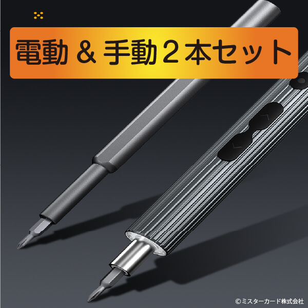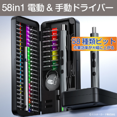 ミスターカード株式会社(本社所在地:埼玉県川口市)は、作業効率化と繊細な作業別に使い分けることができて、とっても便利な電動と手動ハンドルセットの 「58in1電動&手動ドライバー」を2024年2月16日(金)から発売いたします。50種類のビットと8つのパーツを備えた電動ドライバー&手動ドライバーのセットです。作業効率を高める電動ハンドルは高耐久軽量のアルミ合金ボディを採用、正回転・逆回転、3つのLEDライトで照らし、200rpmのパワー、約400回使用できます。細かいネジの締め付けなど繊細な作業には手動ハンドルを利用できます。精密ドライバーには、マグネット化してネジの紛失防止や消磁できるマグネタイザー機能や180度開閉する収納ケースなど特長もあります。いろいろな機器で使用できる精密ドライバーセットが1台あるととっても便利です。