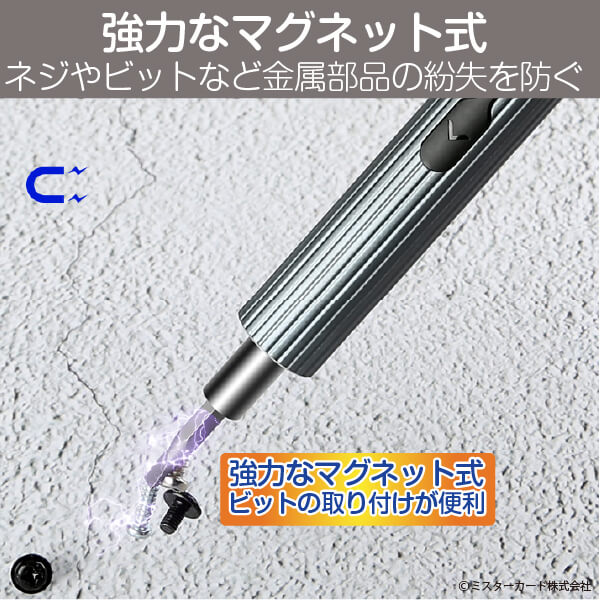 【 マグネタイザー機能 】 ドライバーを磁石化、消磁できます。ネジや部品が磁力でついたり、離れたりする便利な機能です。