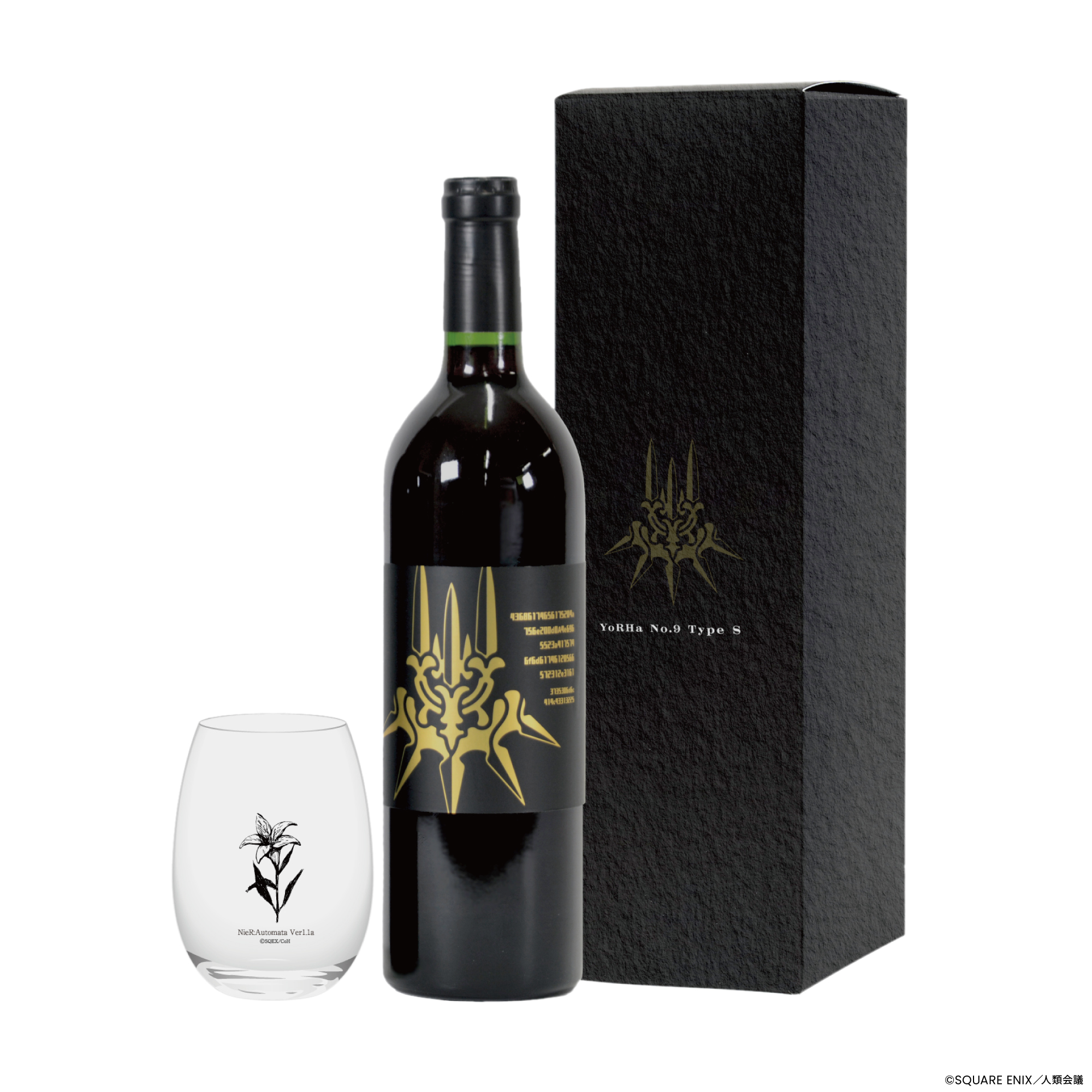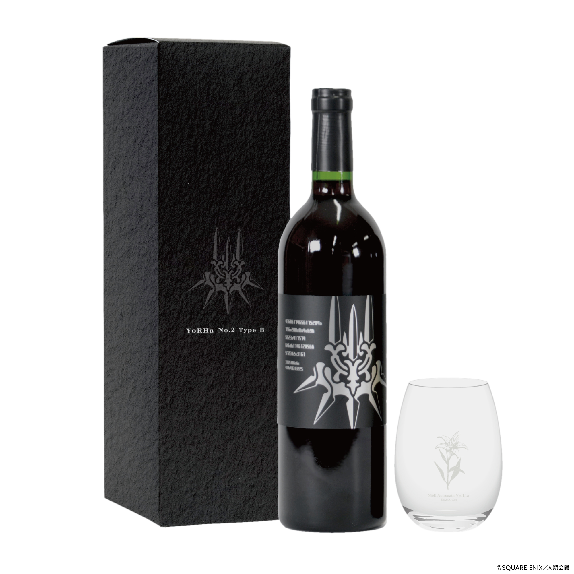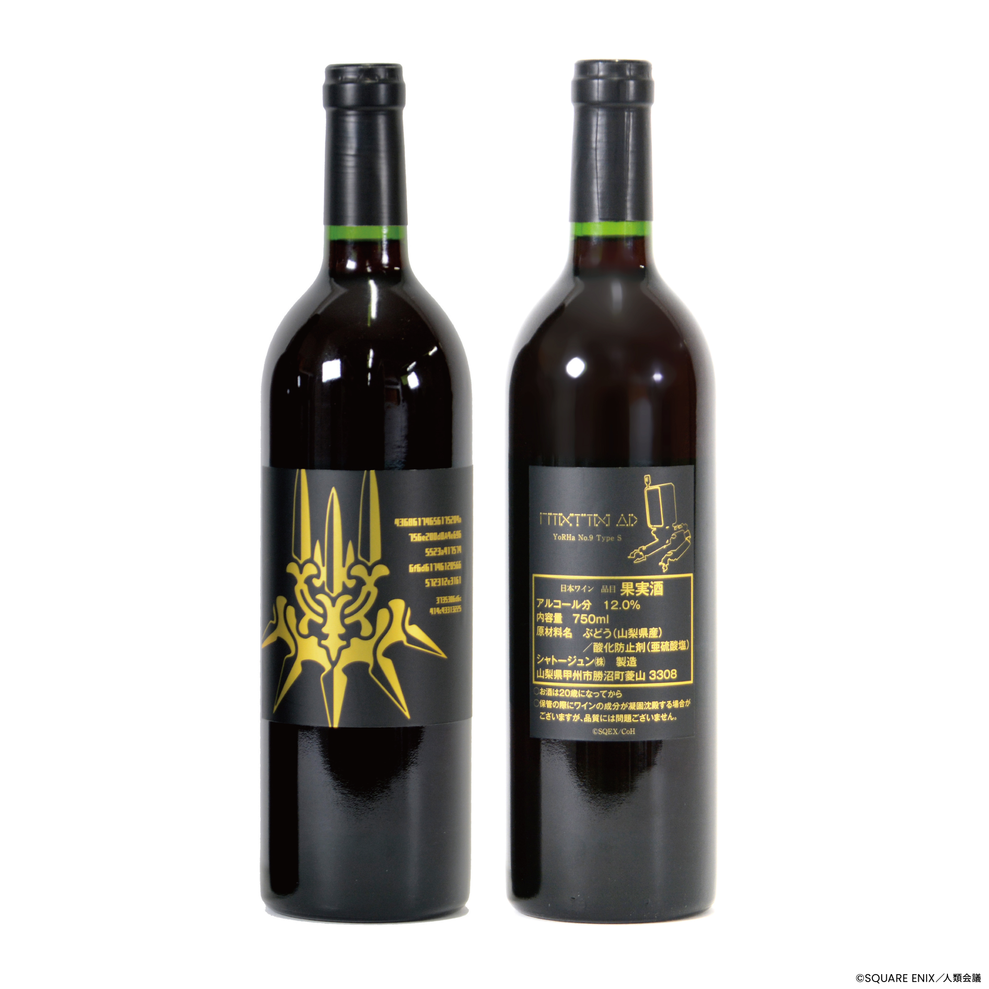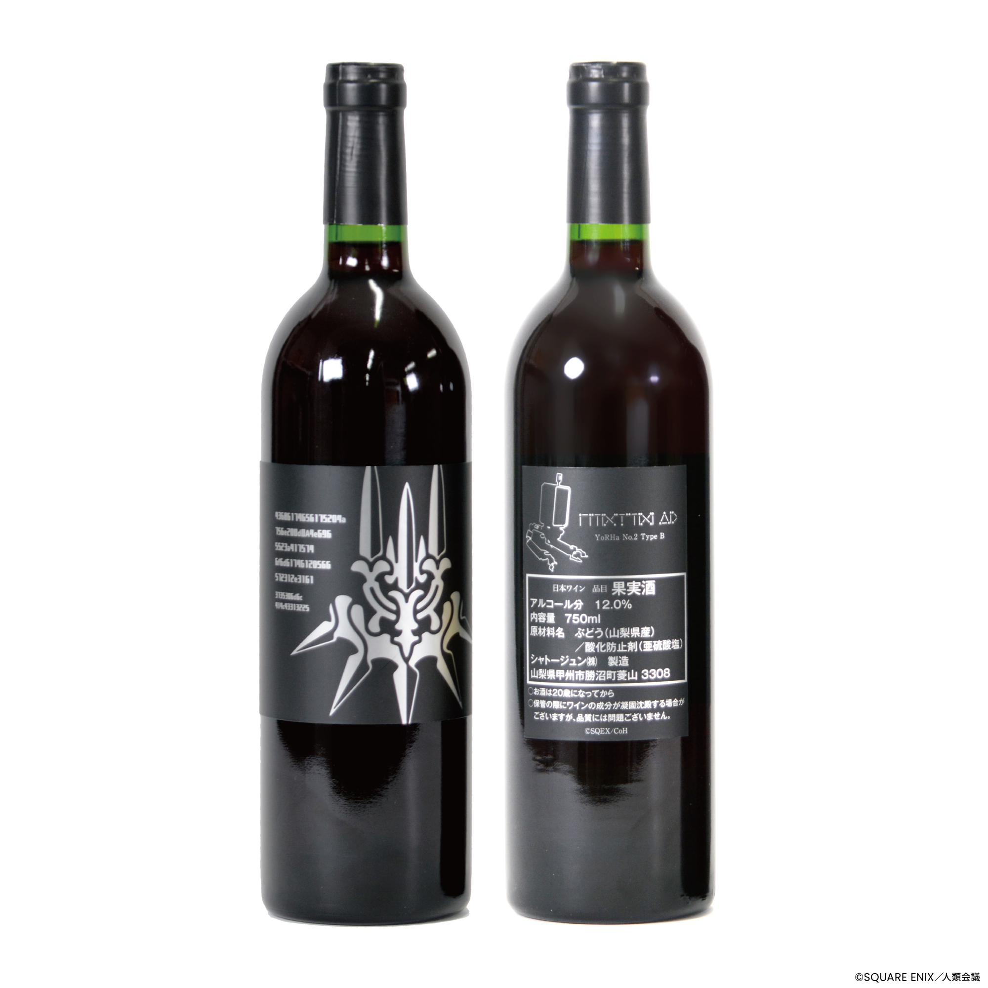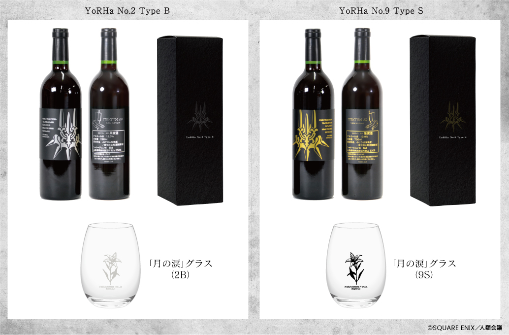今回のワインの葡萄種ですが、「メルロ」「カベルネソーヴィニヨン」「山ソーヴィニヨン」の3種類を使用した赤ワインで、2B、9Sボトルの各プレイリスト※2をワイン樽に取り付けた加振器により、約半年間じっくり聴かせ熟成させました。当社技術ノウハウの証として、「Matured by Onkyo」が付与されております。表のラベルにはヨルハエンブレムを色違いで表現、裏ラベルにはワンポイントで各ポッドが装飾されております。特典としては作中の植物「月の涙」をこちらも色違いで表現したオリジナルワイングラスが付いてきます。
