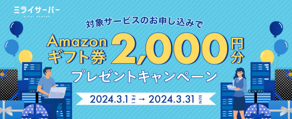 ミライサーバー(運営会社:アシストアップ株式会社、所在地:大阪府大阪市、代表取締役:青木 勝彦)は、2024年3月1日(金)~2024年3月31日(日)の期間、Amazonギフト券キャンペーンを実施いたします。