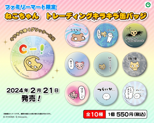 エイノバ株式会社(本社:東京都千代田区、代表取締役社長:安倍義人)がマネジメントする人気キャラクター「ねこちゃん」の新作缶バッジが2024年2月21日(水)よりファミリーマート限定で発売されます。