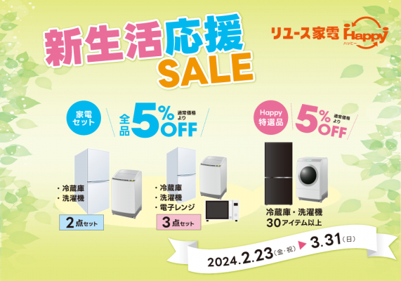 オフィス家具や家電、ビジネスホンなどのリユース事業を展開する株式会社トミザワ(本社:東京都江戸川区、代表取締役:富沢博)が運営する、家電専門の「リユース家電Happy(ハッピー)」 では、新生活に必要な家電がお得に揃う“新生活応援キャンペーン”を、店舗およびオンラインストアにて、2月23日(金)より開催いたします。