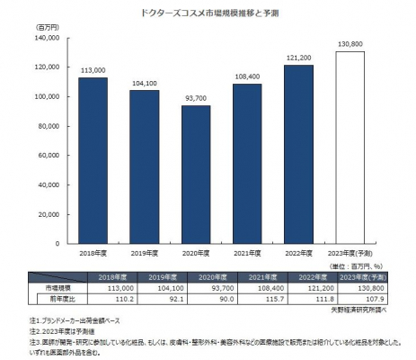 2023年度のドクターズコスメ市場規模は、ブランドメーカー出荷金額ベースで前年度比107.9%の1,308億円と予測した。