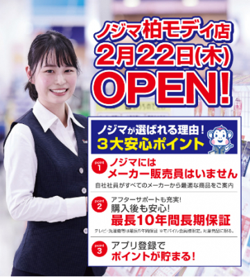 株式会社ノジマ(神奈川県横浜市 代表執行役社長 野島廣司 以下「当社」といいます)は、2024年2月22日(木)より柏モディ3階に【ノジマ柏モディ店】をオープンいたします。