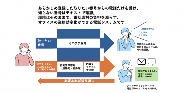 2.新規の番号、知らない番号については自動応答により伝言メッセージを残すように案内。伝言メッセージはテキストでメールやチャットツールにて自動送信(チャットツール対応は開発予定)。新規の問い合わせ等の取りこぼしを防ぐと同時に、必要あれば折り返して対応。