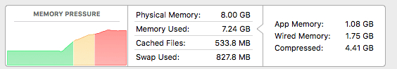 このグラフは、Mac の物理メモリ (RAM) の使用状況を示しています。緑色の部分は使用中のメモリ、黄色部分は圧縮されたメモリ、赤色の部分はスワップファイル使用量を表します。