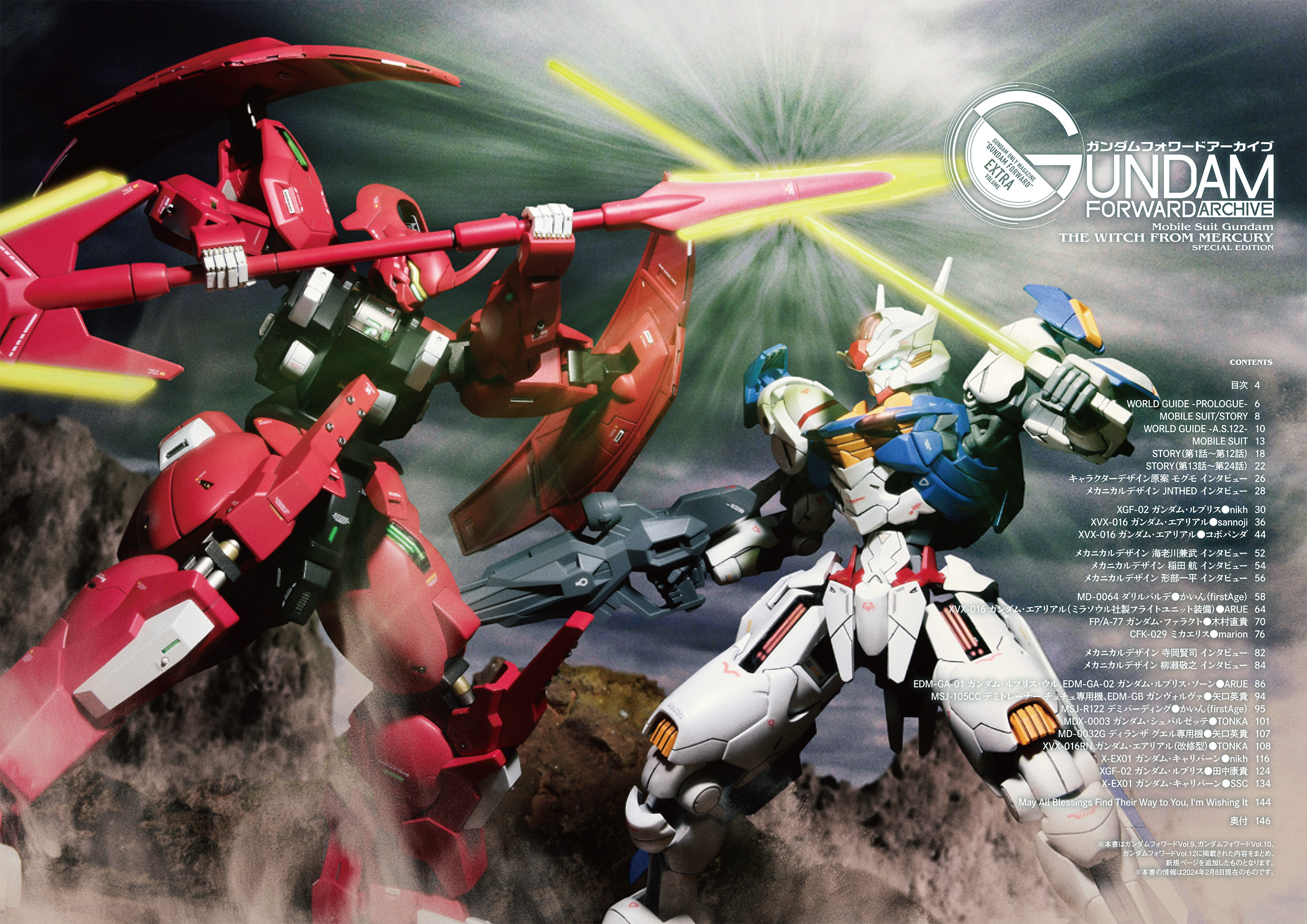 本書は、2022年11月刊行の「ガンダムフォワードVol.9」、2023年9月刊行の「ガンダムフォワードVol.12」に収録された『機動戦士ガンダム 水星の魔女』特集をまとめ、さらに新規ガンプラ作例を多数追加した豪華版となります。そのほか『水星の魔女』のキャラクターデザインやメカニカルデザインを担当した制作スタッフ陣のインタビューも多数収録!