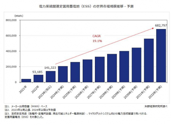 株式会社矢野経済研究所(代表取締役社長:水越孝)は、2024年の電力系統関連の定置用蓄電池(ESS)世界市場を調査し、設置先別及び需要分野別、電池種別の動向、参入企業動向、将来展望を明らかにした。