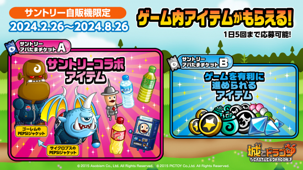 株式会社アソビズム(本社:東京都千代田区、代表取締役:大手智之)は、App Store・Google Playにて好評配信中の『城とドラゴン』で、サントリー食品インターナショナル株式会社(本社:東京都港区、代表取締役社長:小野 真紀子)とのコラボキャンペーンを、2024年2月26日(月)より開催いたします。