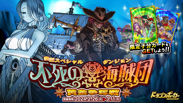 株式会社アソビズム(本社:東京都千代田区、代表取締役:大手智之)は、App Store・Google Playにて好評配信中のリアルタイム合体カードバトル『ドラゴンポーカー』で、2024年2月26日(月)より復刻スペシャルダンジョン「不死の海賊団 黄金争奪戦」を開催いたします。