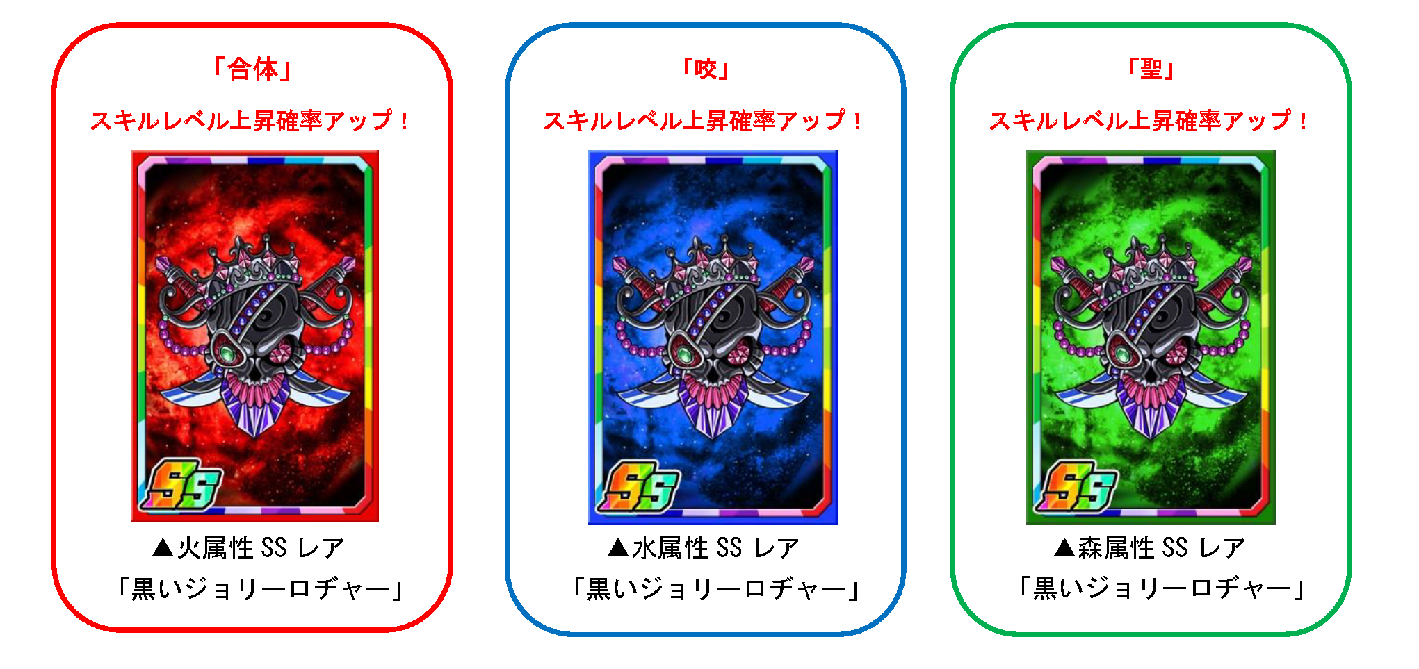 「海賊P」を使い素材ガチャを回すと、限定強化素材「黒いジョリーロヂャー」を手に入れることができます。一部のモンスターに使うと強化値2倍の効果があるほか、合体・咬・聖のスキルレベル上昇確率もアップします。