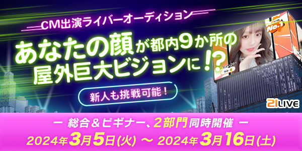 株式会社エムアンドティーティー(本社:沖縄県北谷町、代表取締役:井藤 三知子)が運営するエンターテイメント・ライブ配信アプリ【21LIVE(ニーイチライブ)】URL: https://21.live では、3月5日(火)から3月16日(土)にかけて「CM出演ライバーオーディション」を開催。東京都内8カ所9面の屋外ビジョンで放映する新CMへの出演権を賭けたランキングイベントが始まります。