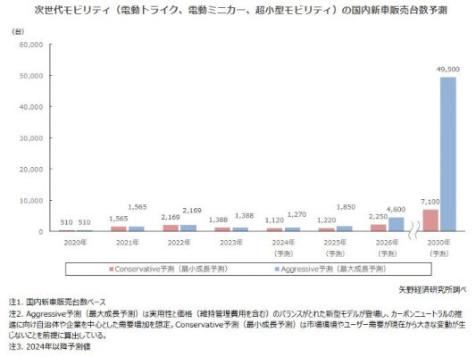 国内の次世代モビリティ(電動トライク、電動ミニカー、超小型モビリティ)の新車販売台数は2030年には最大で49,500台(最大成長予測)と予測する。