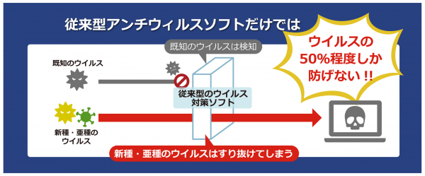 更に従来型のアンチウイルスソフトは、既知のウイルスを検知できる一方で、新種・亜種は検知が難しく、日々膨大に発生するウイルスを50%程度しか防げないとも言われています。そのため侵入されたことに気づくことができず、データ流出等の発見までに長期間を要し、更には自社では発見できず第三者の指摘からデータ流出に気がつく場合もあり、早期発見する仕組みが必要です。