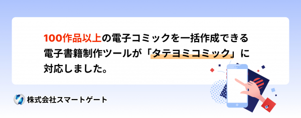 株式会社スマートゲート(本社:東京都豊島区、代表取締役:後藤康宏、以下スマートゲート)は、2024年3月5日、独自開発したコミック用電子書籍制作ツールがタテヨミコミックに対応したことをお知らせします。