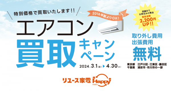 ” エアコン買取キャンペーン”は、3月1日(金)より、リユース家電Happy(https://www.119happy.net)にて開催いたします。引っ越しシーズンを迎え対象商品が不要になった方、買い替えをお考えの方、ぜひこの機会をご利用ください。