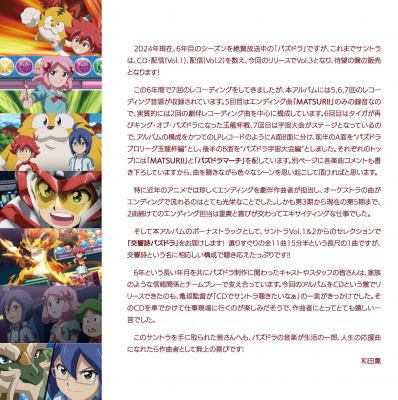 そして本アルバムのボーナストラックとして、サントラVol.1&2からのセレクションで「交響詩パズトラ」をお届けします! 選りすぐりの全11曲15分半という長尺の1曲ですが、交響詩という名に相応しい構成で聴き応えたっぷりです!!