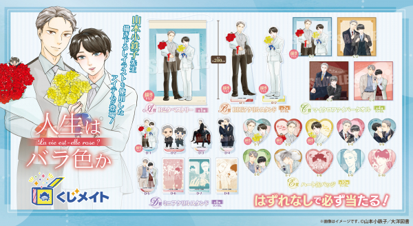 アニメイト通販の「くじメイト」に、大人気BLコミック『人生はバラ色か』のオンラインくじが登場です。景品デザインには今回の「くじメイト」のために、山本小鉄子先生に描き下ろしていただいた新規描き下ろしイラストも登場!《バラの花束》をテーマにした美麗イラストは必見です!