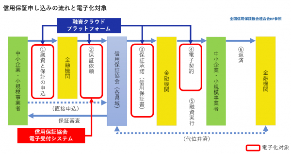 2023年、一般社団法人 全国信用保証協会連合にて、「信用保証協会電子受付システム」の運用が開始されました。「信用保証協会電子受付システム」は、各金融機関と信用保証協会が利用できる共通のプラットフォームとしてクラウド上に構築され、システムを介すことで、申込手続きにかかる各種データを授受し、手続きを電子化することが可能になりました。