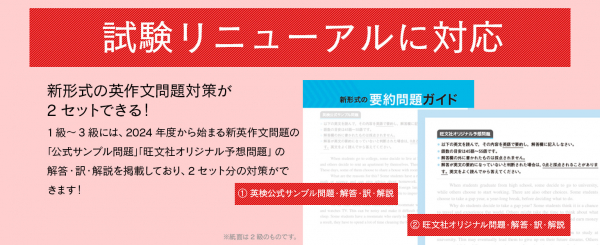 1級から3級には、2024年度から始まる新英作文問題の「公式サンプル問題」「旺文社オリジナル予想問題」の解答例・訳・解説を掲載しており、2セット分の対策ができます!