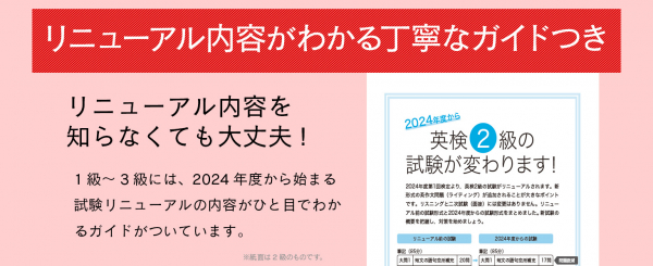 リニューアルについて知らなくても大丈夫!1級から3級には、2024年度から始まる試験リニューアルの内容がひと目でわかるガイドがついています。
