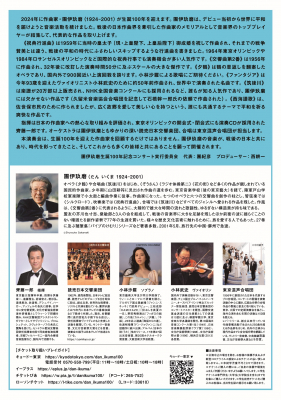 本演奏会は、生誕100年を迎えた作曲家を回顧するだけではありません。團伊玖磨の音楽が、戦後の日本と共にあり、時代を彩ってきたこと、そしてこれからも多くの皆様と共にあることを願って開催されます。(團伊玖磨生誕100年記念コンサート実行委員会 代表:團紀彦、プロデューサー:西耕一)