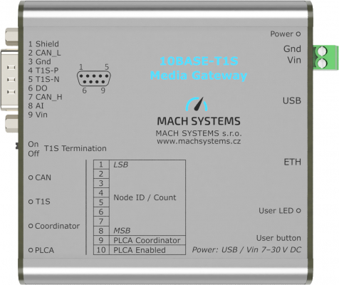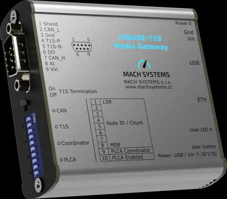 10BASE-T1Sメディアゲートウェイは、CAN(/FD)ゲートウェイとユーザープログラミング機能を備えた柔軟な10BASE-T1Sスイッチです。このデバイスは、1つの10BASE-T1Sポート、1つのファストイーサネットポート、CAN FDをサポートするCANチャネル、およびUSB 2.0ポートを備えています。