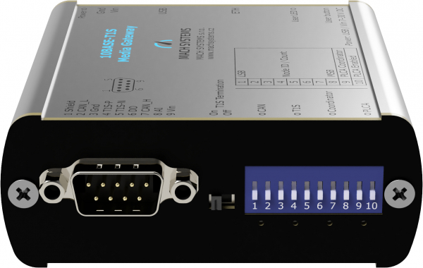 シングルペアイーサネット10BASE-T1Sポートは、CSMA/CDモードとPLCAモードの両方をサポートし、ポイントツーポイントおよびマルチドロップネットワークトポロジを可能にします。モード、BEACON送信(PLCAコーディネータ)、ノードID/ノード数、バス終端などのポート構成は、オンボードのDIPスイッチで簡単に設定できます。
